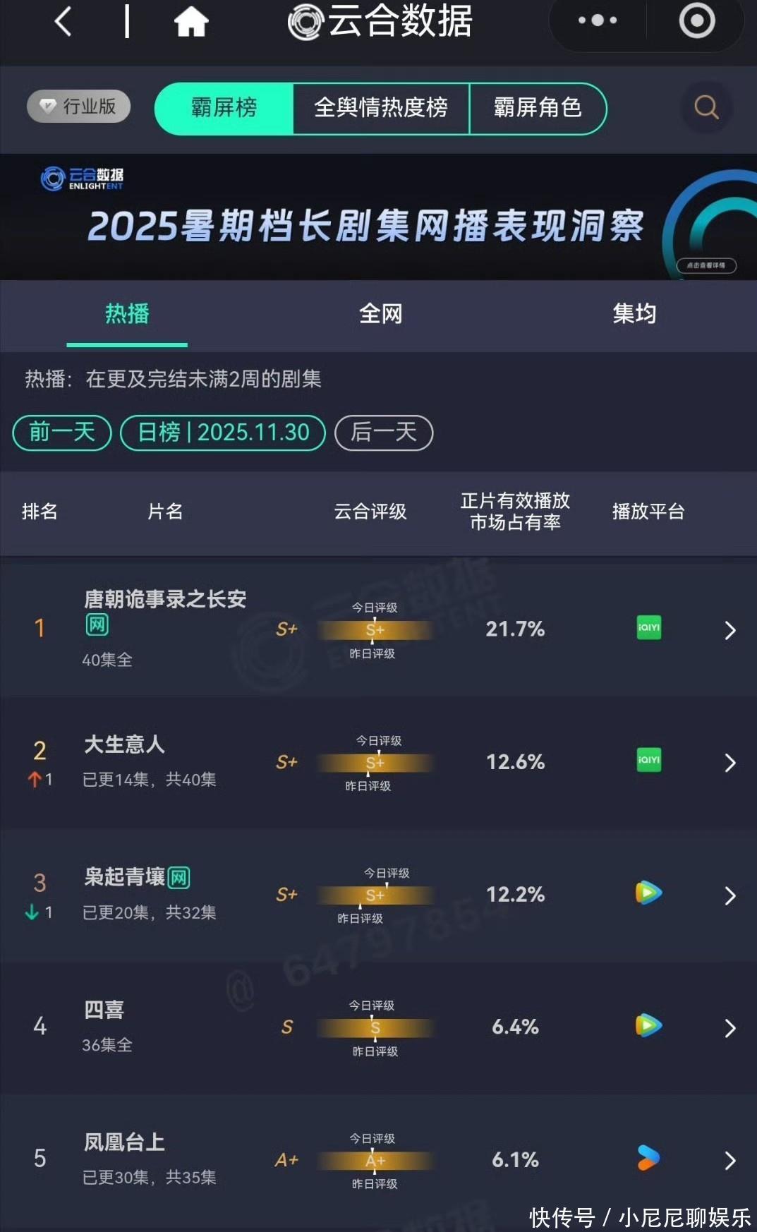 迪丽热巴、陈晓陈晓主演的电视剧《大生意人》云合竟然超越了迪丽热巴主演的电视剧《枭起青壤》,《枭起青壤》已经横盘好几日了,11月30日还是周末,云合竟然还降了,后面要是剧情跟不上《枭起青壤》估计悬了。